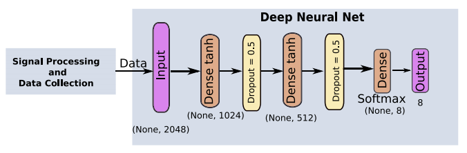 除了上面讨论的CNN之外,本文还使用全连接(密集)DNN来完成可信发射机分类的任务。DNN的实现类似于GAN的判别器模型,如图5所示。唯一的区别是softmax输出层有8个节点来识别8个发射器(如果有k个发射器,则更一般地为k个节点)。本文实现了一个具有5层、1个输入层和4个密集层的DNN。本文对这个模型中的密集层使用tanh激活函数。应用偏差和正则化来避免欠拟合和过拟合。在这种情况下,也可以使用基于Adam的优化,学习率为10^(-3),进行分类交叉熵训练。