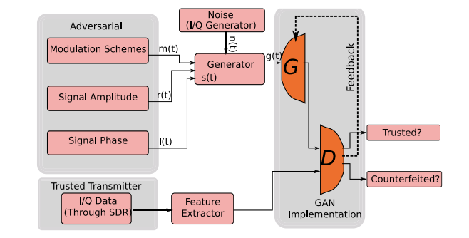 如图1所示,提出的GAN框架有两个主要组成部分:使用给定数据分布生成错误数据的生成模型(G)和估计概率的判别模型(D)样本来自训练数据(即已知发射机)而不是G。对手生成随机调制方案(m(t))、信号幅度(r(t))和相位(l(t))并混合加性白高斯噪声(AWGN)(n(t))与错误信号。随着生成器从鉴别器中学习并提高其模仿真实数据的能力,生成的信号(g(t))本质上最初是随机的,它会随着时间的推移而改进。另一方面,鉴别器(D)从生成器(G)和可信发射器中获取输入。这有助于它学习区分真实输入和错误输入。已知的发射机数据被收集并作为原始I/Q值馈送到鉴别器(D)。