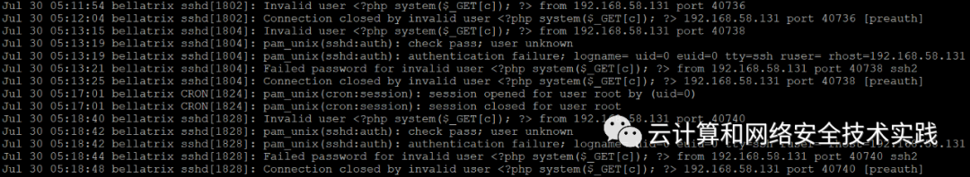 再次查看ssh登录日志文件,是看不到已经注入的webshell的,