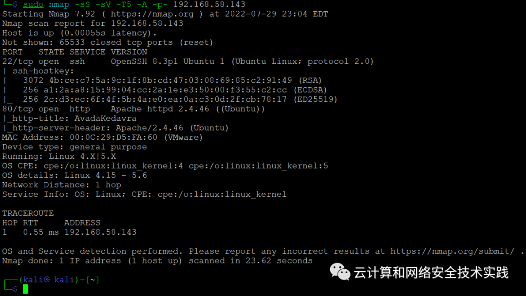 接着进行端口扫描,sudo nmap -sS -sV -T5 -A -p- 192.168.58.143,