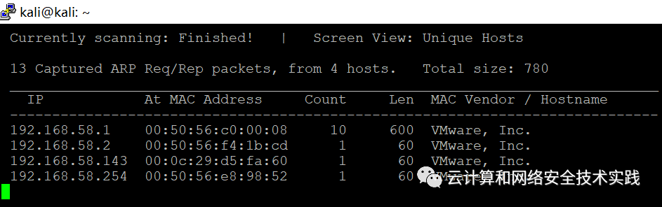 用workstation导入成功,进行地址扫描,拿到地址192.168.58.143,