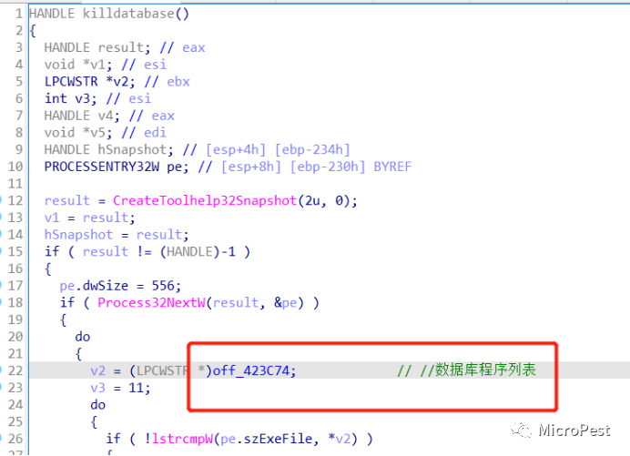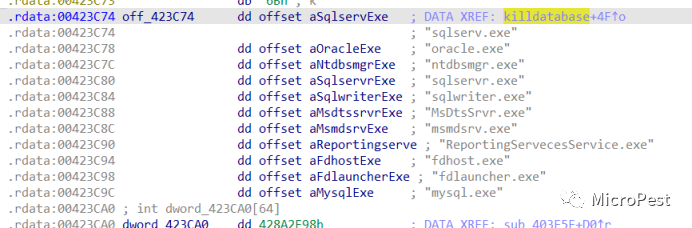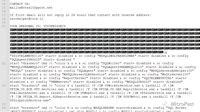 原来是勒索词和要执行的命令,有好几块,禁服务、杀进程等跟安全相关的操作。