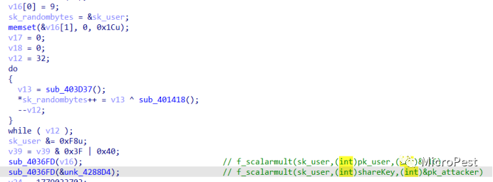 程序中首先为当前用户生成一对ECDH公私钥sk_user和pk_user,均为32字节。攻击者的ECDH公钥pk_attacker被内置于程序中,被用于和sk_user生成会话密钥ShareKey。ShareKey将被用于当前机器的文件加密。