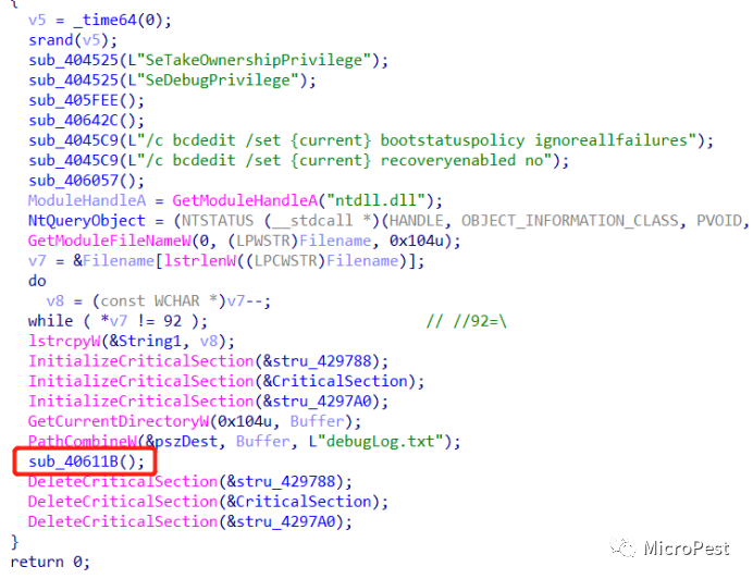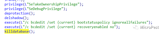3、如果判定达成,程序首先会提取系统权限,然后破坏系统保护,删除卷影备份,禁用系统故障重启和修复功能。