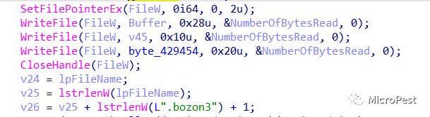 完成准备工作,程序会启动大量加密线程cryptfile->StartAddress,对文件进行加密,将文件后缀名修改文 bozon3,最后释放勒索信。