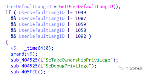 2、程序运行后,会对系统语言进行判断,如果系统使用语言为俄罗斯语、哈萨克语、白俄罗斯、乌克兰、 鞑靼语,则不勒索。