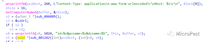 在这里 取到了机器名和 生成的 机器编号(由系统启动到现在的时间和进程PID和线程PID进行xor来生成id值)。一般情况下,这时子程序会将这串值传回C&C以作以后交赎金解密之用,但奇怪的是程序中找到了用以POST的header:“Content-Type:application/x-www-form-urlencoded”,但在调试的过程中始终IP没有出来,真是奇怪,不知道往哪回传。有几种可能情况,一是调试时没取到;二是怀疑这是个阉割版,根本就不回传,只能跟作者留下的邮箱联系,交赎金发解密程序。