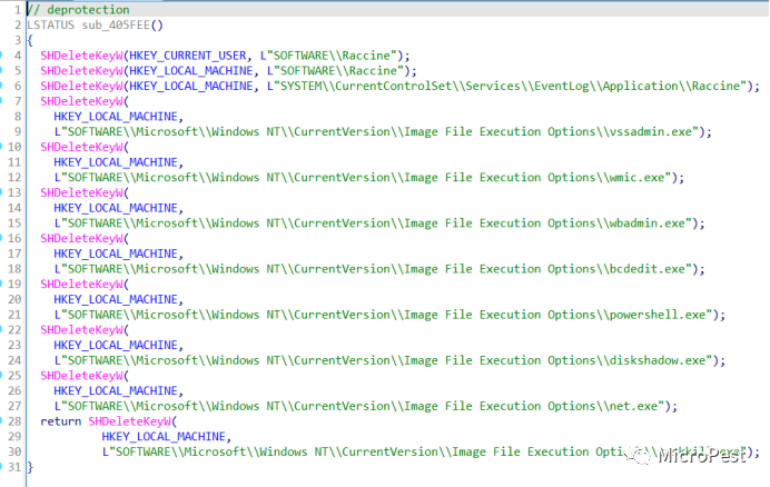 这里破坏系统保护,主要是让 Raccine 通过镜像文件劫持对抗勒索病毒的手段失效。Raccine 是一个开源勒索软件保护程序,能够拦截有勒索病毒相关行为的进程。
