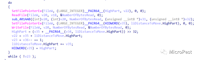 加密目标文件时,每次跳过一个指定的偏移量,均匀地从文件头部读至文件尾部进行加密并写回原偏移,每次读取0x1000字节(4KB)。