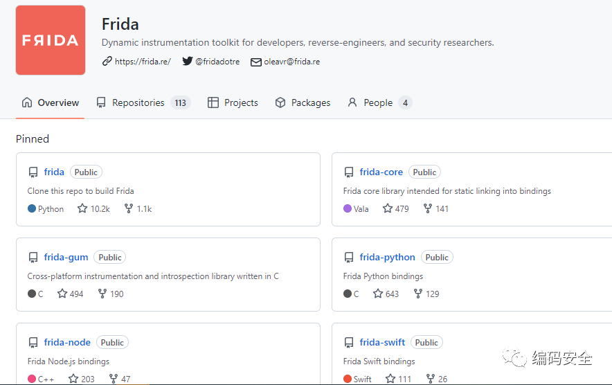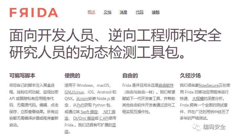 Frida框架的核心是C语言开发的,同时它有多种语言绑定例如 Node.js、JavaScript、Python、Swift、.NET等等。