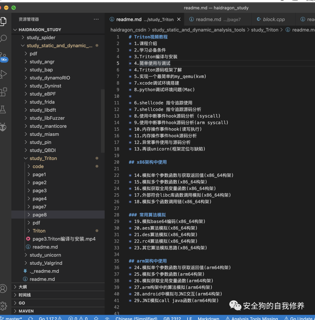 # llvm/ollvm视频教程## llvm* 1.llvm介绍* 2.llvm项目编译与安装(macOS/linux)* 3.llvm项目编译与安装(Windows)* 4.clang编译与调试(xcode)* 5.clang编译与调试(Windows)* 6.clang外部项目构建与安装(xcode)* 7.Compiler-RT介绍与使用* 8.libc++标准库介绍* 9.使用llvm独立工具* 10.编写第一个llvm项目* 11.clang插件编写* 12.clang前端-之实现一个自定义检查规范* 13.编写第一个llvm pass(编译与调试)* 14.clang前端-之实现clang诊断* 15.clang前端-之理解词法分析与实现遍历* 16.实现一个函数名称加密Pass## ollvm* 17.ollvm介绍* 18.ollvm编译(macOS)* 19.ollvm集成xcode(mac/ios)* 20.使用ollvm注意事项* 21.ollvm 集成android(ndk)* 22.ollvm android中使用* 23.ollvm 老版本代码提取(移植)* 24.集成Visual Studio(windows上使用)* 25.在驱动(内核)中的使用* 26.ollvm -源码分析之sub(指令替换)* 27.ollvm -源码分析之fla(控制流程平坦化)* 28.ollvm -源码分析之bcf(虚假控制流程)* 29.ollvm -源码分析之其它杂项* 30.最后一个实战字符串加密Pass