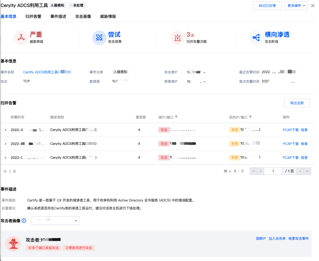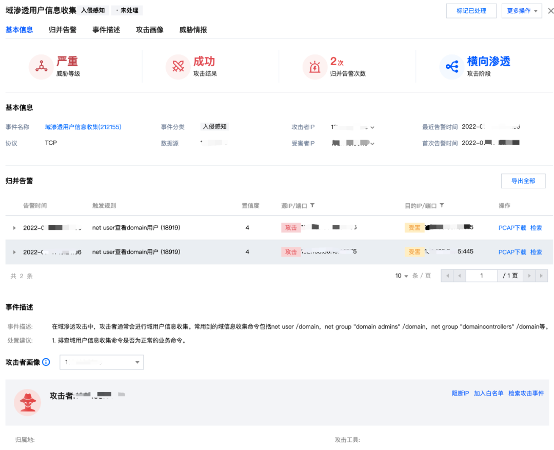 腾讯高级威胁检测系统(御界NDR)通过域渗透防御能力成功检测出了攻击者在整个事件的钓鱼阶段、域信息收集阶段、提权阶段产生的恶意文件和异常SMB、LDAP、Kerberos东西向恶意流量,准确定位到攻击队跳板机及失陷资产,有效还原事件全貌,及时采取针对性的应急加固措施,防止了攻击范围的扩大。