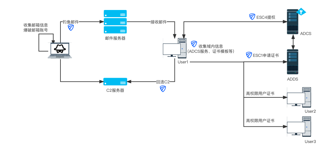 在和国内某头部金融企业的攻防演练合作中,攻击队通过钓鱼邮件进入内网后,通过BloodHound、Certity等工具收集域内组织架构、ACL、ADCS服务、证书模板等信息,发现了ADCS服务中存在配置错误的证书模板,使低权限用户具有 WriteDacl权限,所以攻击队利用ESC4进行提权,使低权限用户通过ESC1伪造身份申请高权限证书进行身份验证,以此打下域控。