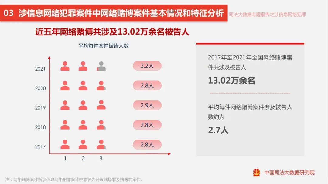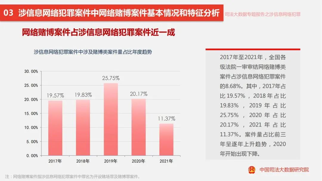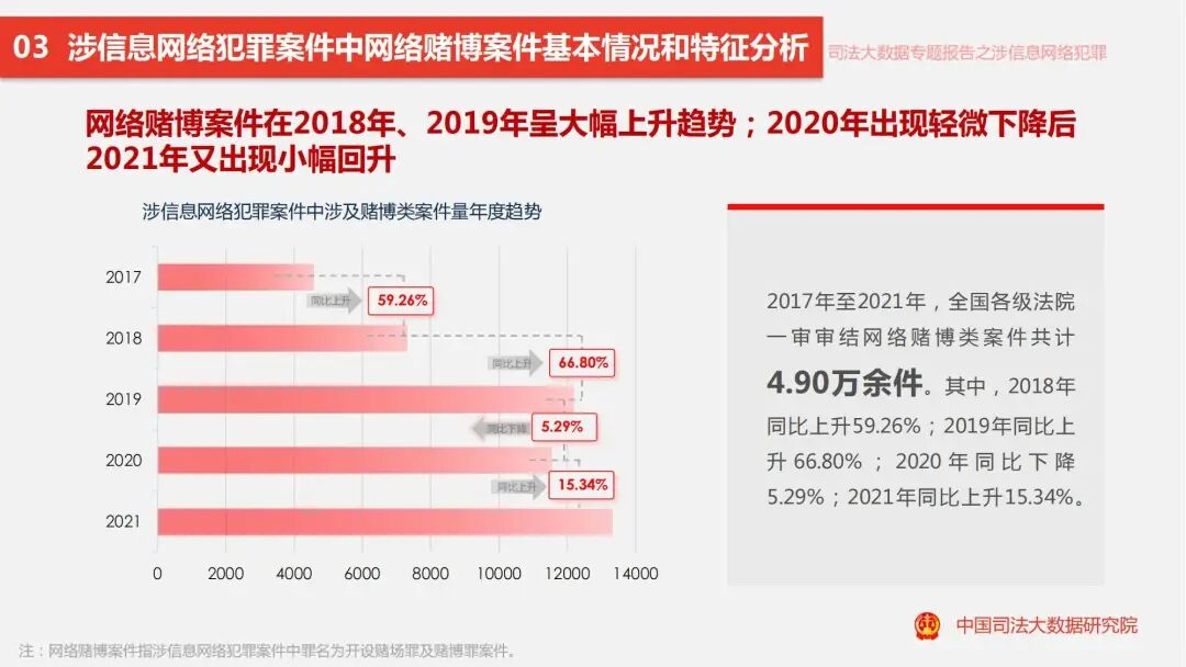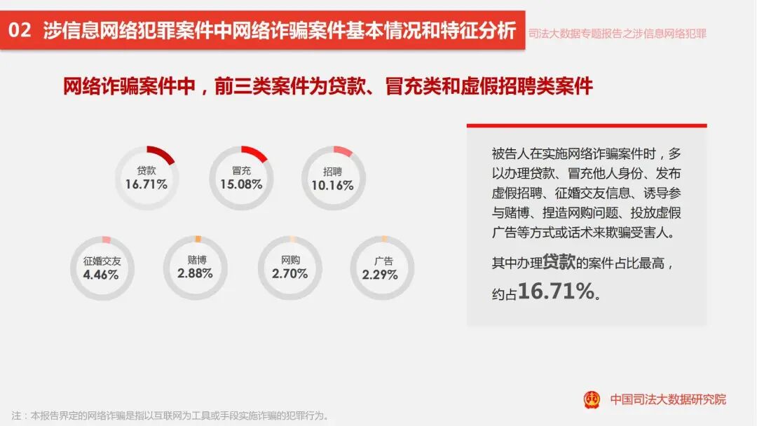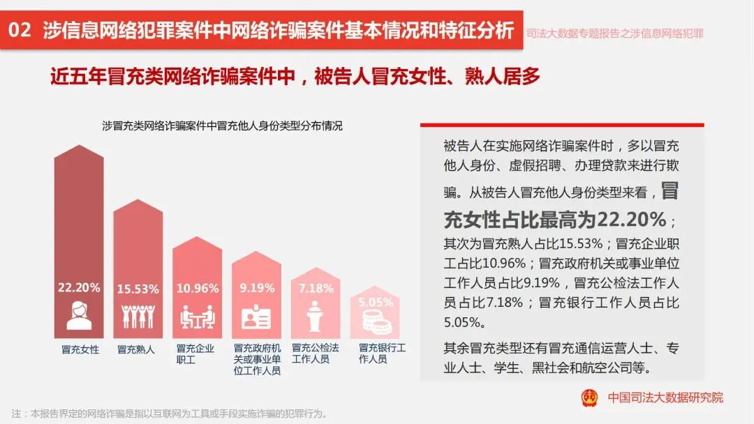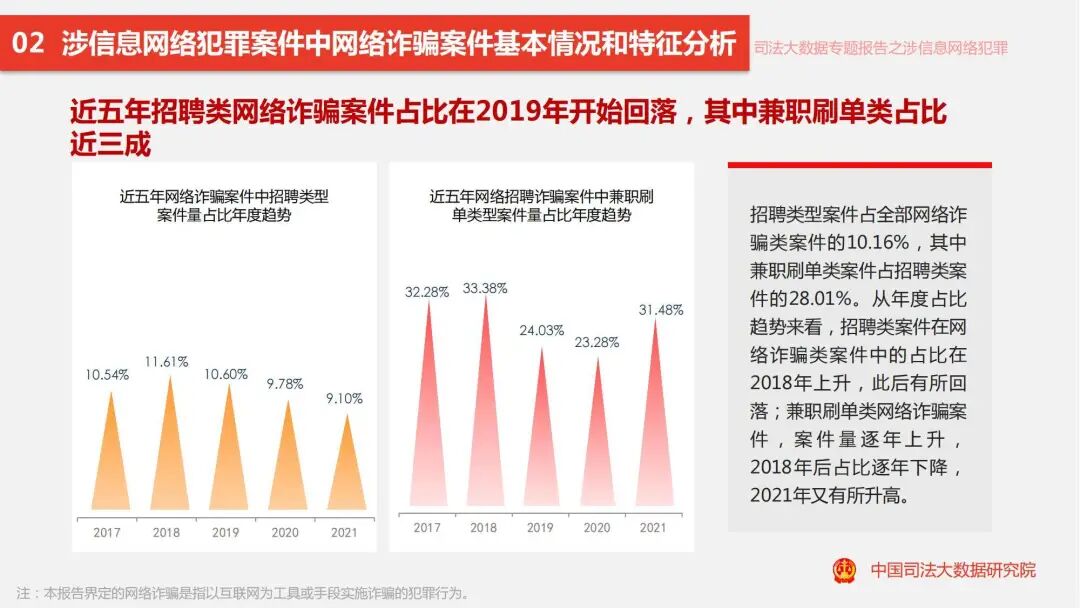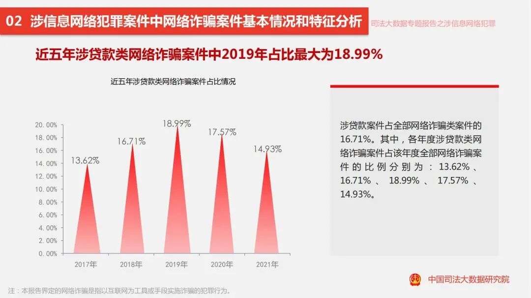 该《报告》对近五年全国各级人民法院一审新收、已结涉信息网络犯罪案件的趋势及网络诈骗、网络赌博以及帮助信息网络犯罪活动罪等重点犯罪案件特点进行了深入分析。《报告》显示,2017年至2021年,全国各级法院一审审结的涉信息网络犯罪案件共计28.20万余件,案件量呈逐年上升趋势,其中,2018年同比上升57.18%、2019 同比上升28.43%、2020年同比上升20.90%、2021年同比上升104.56%。近四成涉信息网络犯罪案件涉及诈骗罪。2017年至2021年,全国涉信息网络犯罪案件共涉及282个罪名,其中诈骗罪案件量占比最高,为36.53%;其次为帮助信息网络犯罪活动罪,案件量占比为23.76%;再次为开设赌场罪,案件量占比为14.81%。《报告》显示,2017年至2021年全国涉信息网络犯罪案件共涉及66万余名被告人,平均每件涉信息网络犯罪案件涉及被告人数约为2.4人。其中,3人及以上的共同犯罪案件占比为9.50%。被告人年龄主要集中在18岁至39岁,29岁及以上被告人占比逐年降低,其中,18岁至28岁被告人占比在2019年达到最低后又出现上升,存在网络犯罪罪犯年轻化的苗头,29岁及以上被告人占比逐年降低。数据还显示,2021年帮助信息网络犯罪活动罪在涉信息网络犯罪案件中的占比开始激增。2017年至2021年,全国各级法院一审审结的帮助信息网络犯罪活动罪占涉信息网络犯罪案件的11.88%,其中各年度的占比分别为:0.06%、0.07%、0.22%、5.78%和54.27%。帮助信息网络犯罪活动罪案件2020年同比激增34倍,2021年同比再增超17倍,具体为:2018年同比上升125.00%,2019年同比上升191.67%,2020年同比上升3469.52%,2021年同比上升1716.17%。《报告》显示,帮助信息网络犯罪活动罪涉及被告人共计14.37万人,2021年被告人占比约九成。从被告人年龄分布看,18周岁至28周岁占比最大,为 55.09%;其次为29周岁至39 周岁,占比34.23%。而超五成帮助信息网络犯罪活动罪作案手段为提供支付结算帮助,占比最大,为53.45%。《报告》还显示,2021年网络诈骗类案件近5年首次出现下降。2017年至2021年,全国各级人民法院一审审结网络诈骗类案件共计10.30万件。其中,2018年同比上升71.69%;2019年同比上升25.15%;2020年同比上升40.36%;2021年同比下降 17.55%。网络诈骗案件中,前三类案件为贷款、冒充类和虚假招聘类案件。被告人在实施网络诈骗案件时,多以办理贷款、冒充他人身份、发布虚假招聘、征婚交友信息、诱导参与赌博、捏造网购问题、投放虚假广告等方式或话术来欺骗受害人。其中办理贷款的案件占比最高,约占16.71%。近五年,涉贷款类网络诈骗案件中2019年占比最大为18.99%。涉贷款案件占全部网络诈骗类案件的16.71%。其中,各年度涉贷款类网络诈骗案件占该年度全部网络诈骗案件的比例分别为:13.62%(2017)、16.71%(2018)、18.99%(2019)、17.57%(2020)、14.93%(2021)。近五年,冒充类网络诈骗案件中,被告人冒充女性、熟人居多。被告人在实施网络诈骗案件时,多以冒充他人身份、虚假招聘、办理贷款来进行欺骗。从被告人冒充他人身份类型来看,冒充女性占比最高为22.20%;其次为冒充熟人占比15.53%;冒充企业职工占比10.96%;冒充政府机关或事业单位工作人员占比9.19%,冒充公检法工作人员占比7.18%;冒充银行工作人员占比5.05%。其余冒充类型还有冒充通信运营人士、专业人士、学生、黑社会和航空公司等。![]()