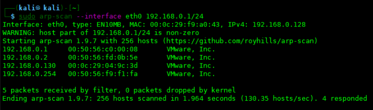 sudo arp-scan --interface eth0 192.168.0.1/24