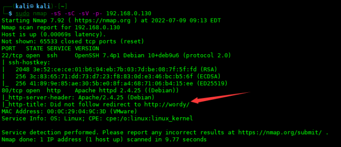通过扫描结果可以看出,通过80端口访问DC-6的web服务会被重定向到http://wordy/