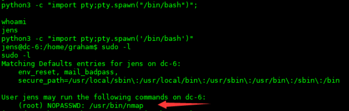 查看Jens的sudo权限,可以看到jens可以无密码通过root权限来运行nmap