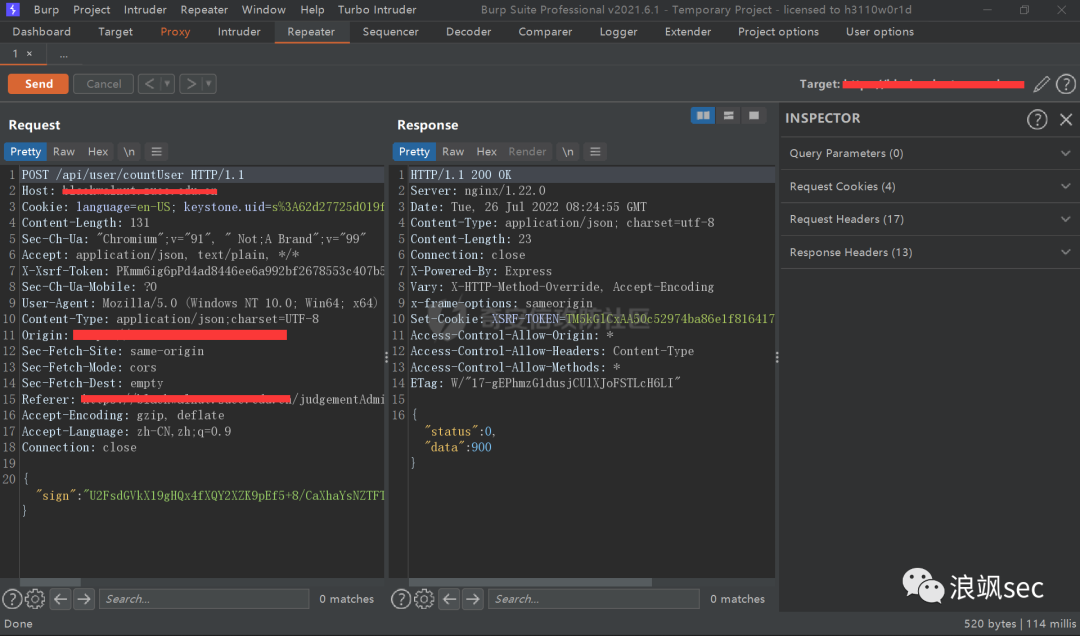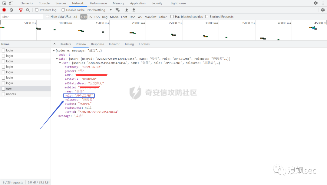 手动构造数据包,成功获取数据!所以如果以后我们从JS找到了一些接口,访问却提示无权限,那么我们就可以尝试在JS里管理员请求所带上的字段,再次尝试访问