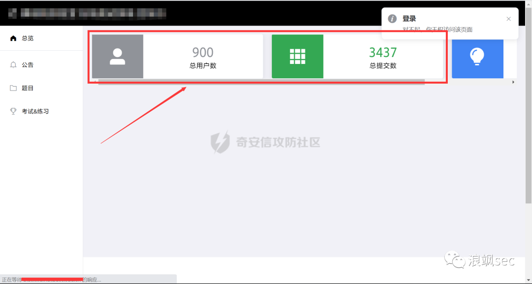 然后尝试拼接实现未授权,拼接,虽然提示没有权限 + 跳转回home页面,但是他这一瞬间显示的总用户和总提交数引起了我的注意,感觉有戏