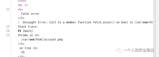 从错误信息中可以得到当前访问PHP页面的绝对路径,所以这里很大的可能性是存在二次[[SQL injection]],触发点就是 account.php 页面。