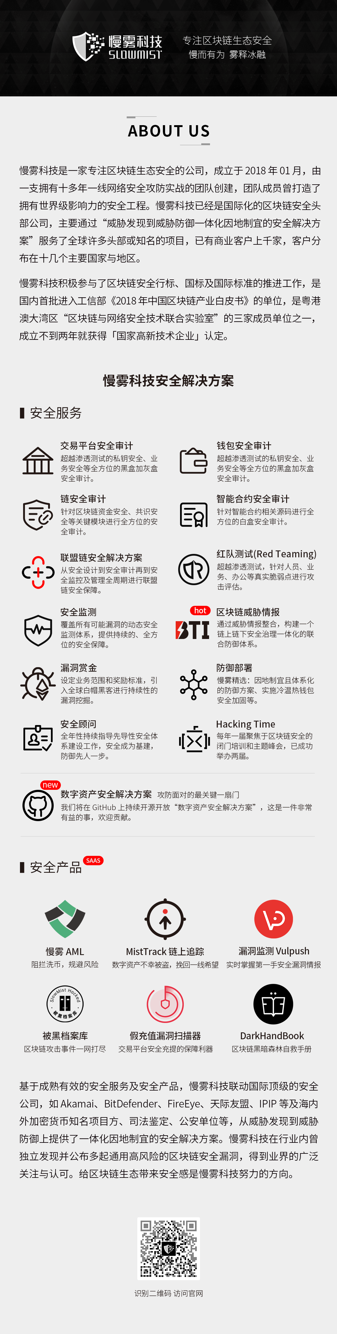 本分析报告内容基于我们对区块链行业的理解、慢雾区块链被黑档案库 SlowMist Hacked 以及反洗钱追踪系统 MistTrack 的数据支持。但由于区块链的“匿名”特性,我们在此并不能保证所有数据的绝对准确性,也不能对其中的错误、疏漏或使用本报告引起的损失承担责任。同时,本报告不构成任何投资建议或其他分析的根据。本报告中若有疏漏和不足之处,欢迎大家批评指正。