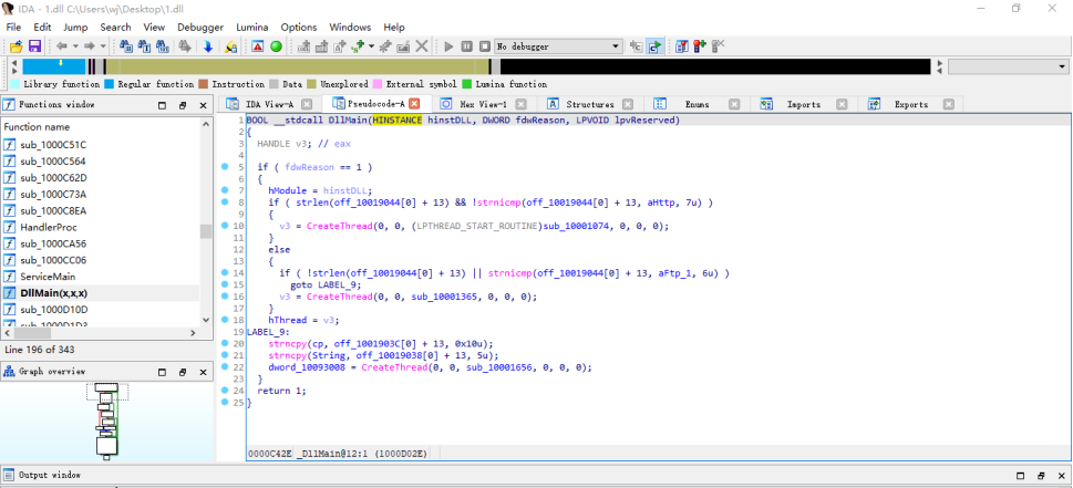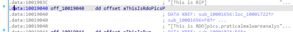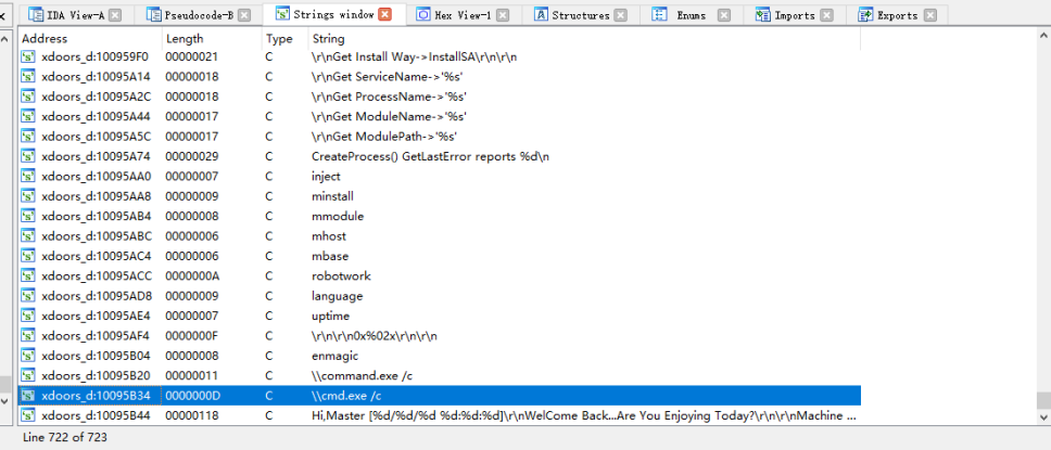43.通过对1.dll恶意程序分析,IDA Pro识别了在0x10001656处的子函数中的多少个参数?(格式填写数字 如:1) (5分)44.通过对1.dll恶意程序分析,字符串“\cmd.exe /c”位于哪里?(格式:格式按大写字母与数字组合填写 如:AB12DC) (5分) 查看字符串。在IDA中选择菜单栏中的view,在open subviews中找到strings,这时候会将DLL中所有的字符串展示出来,拖到后面会发现其物理地址。当然也可以用搜索字符串功能。![]()