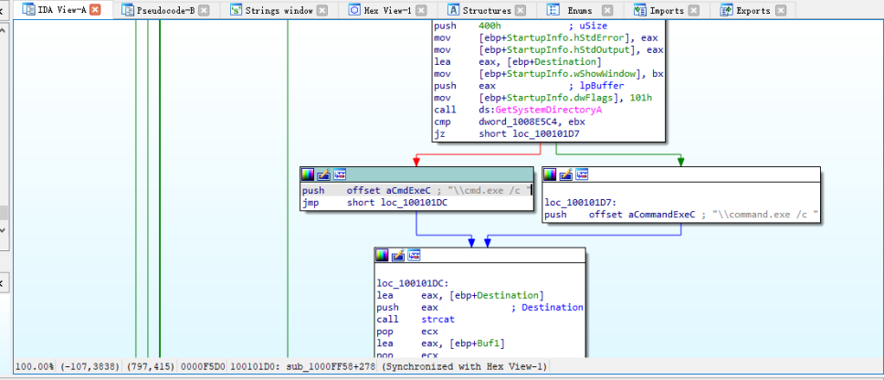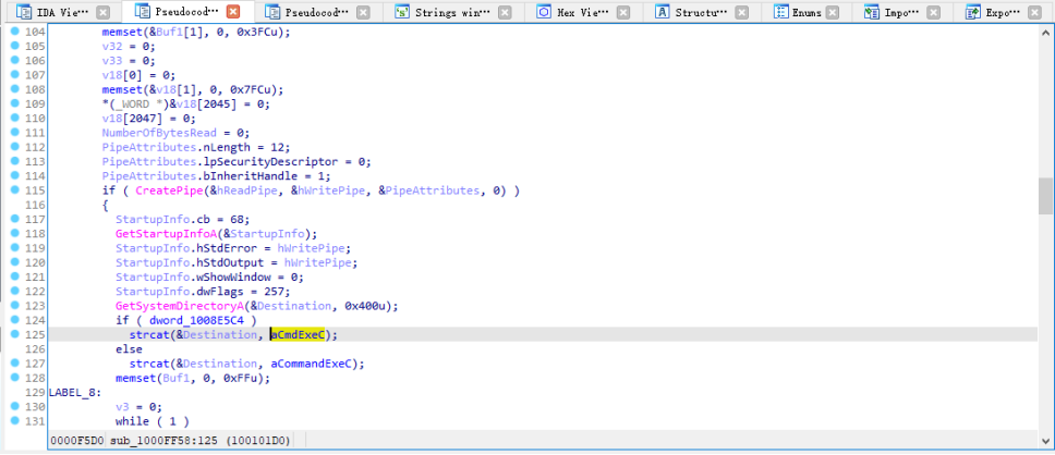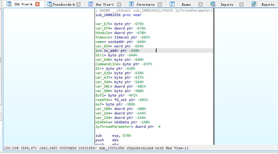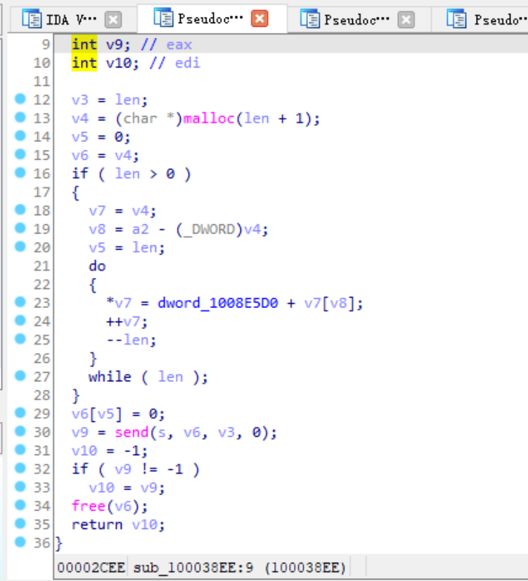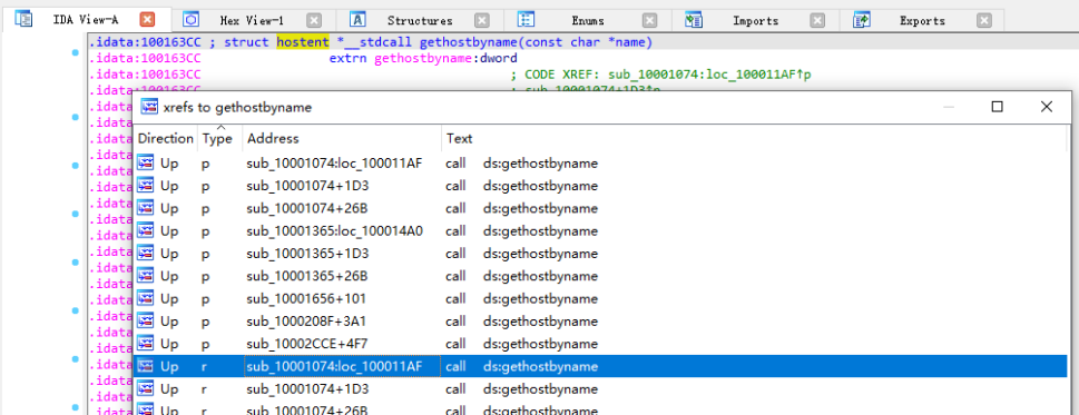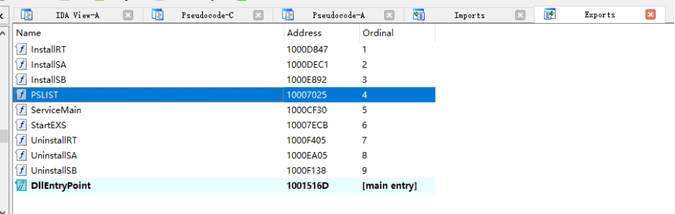 在函数导出表窗口中找到PSLIST函数,双击来到其函数体。经过对其中三个函数的简单分析,发现大部分功能是查看进程情况并通过套接字发送出去,但是这道题要求我们找到其导出的文件,需要继续对这几个函数分析。