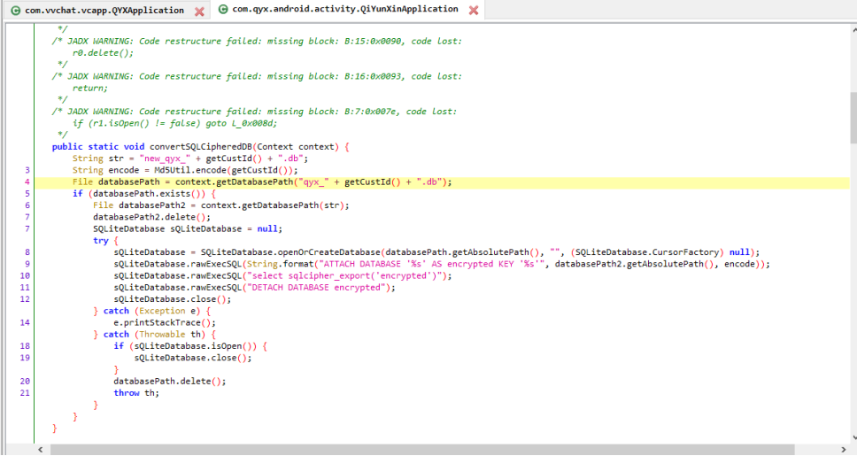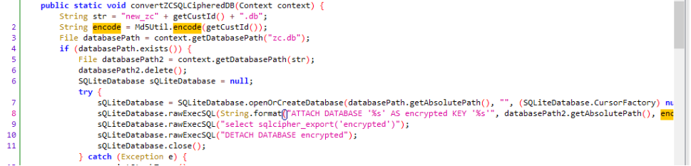 使用工具对该APK进行脱壳处理。APK脱壳过程就不多说了(某取证工具自带脱壳功能,或者通过Frida一类的工具自动化脱壳),接着使用jadx-gui打开脱壳后的APK并全局搜索关键字”new_qyx”和”new_zc”,发现函数”convertSQLCipheredDB”和”convertZCSQLCipheredDB”分别对这两个数据库进行操作,通过分析可知第二行的encode变量就是连接sqlite数据库的密码。