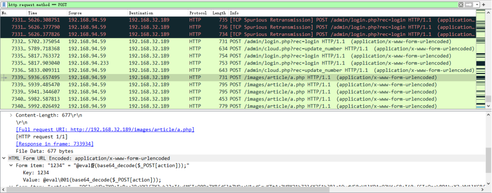 这里仍通过过滤POST包来查找webshell,发现客户端疑似对webshell(a.php)进行操作,且服务器有相关响应,因此推断webshell为a.php。当然对于该webshell怎么产生的,本人并没有梳理出来。