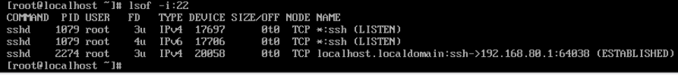 执行lsof -i:22,发现确实运行了sshd;或者执行“netstat -lnpt”