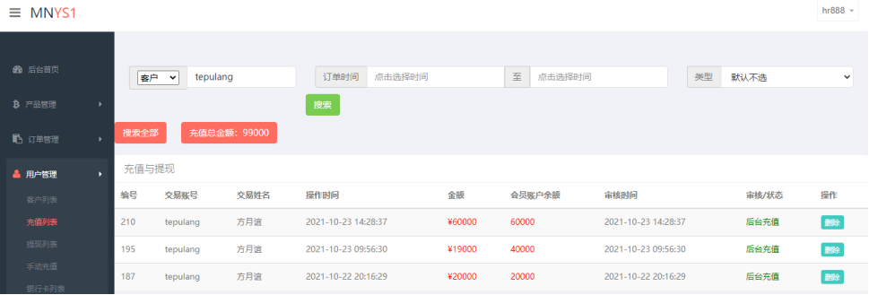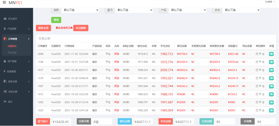 在订单管理页面的交易流水中,检索该用户,下方会自动统计其委托总金额。