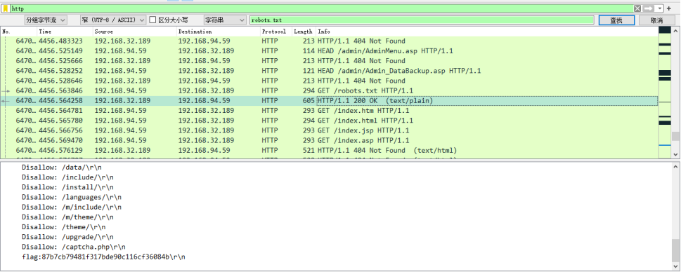 过滤器输入规则:http,在海量HTTP包里搜索关键字robots.txt,接着查看上下文来查找flag内容。