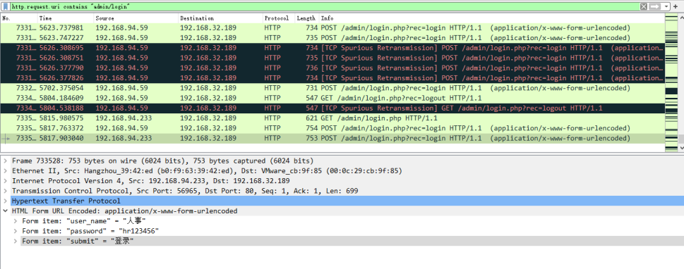 经过对前面登录流量包的分析可知,登录入口在/admin/login.php中,于是在过滤器中输入规则:http.request.uri contains "admin/login" ,倒着梳理登录HTTP包,发现最后一个就是人事的密码。比较坑的是,由于“人事”被url编码,无法通过搜索功能查找,当然大家可以尝试将相关关键字url编码,然后查找流量包中包含该url编码的数据。