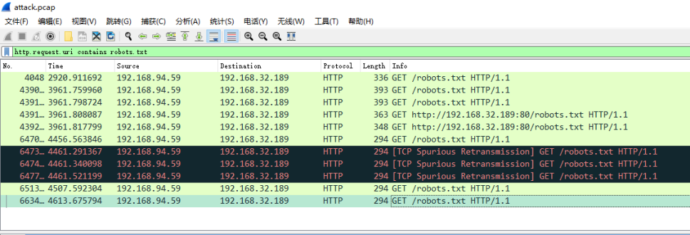 也可以过滤器中输入:http.request.uri contains robots.txt ,将所有请求robots.txt的客户端筛选出来,接着通过TCP流功能来追溯服务器响应内容。