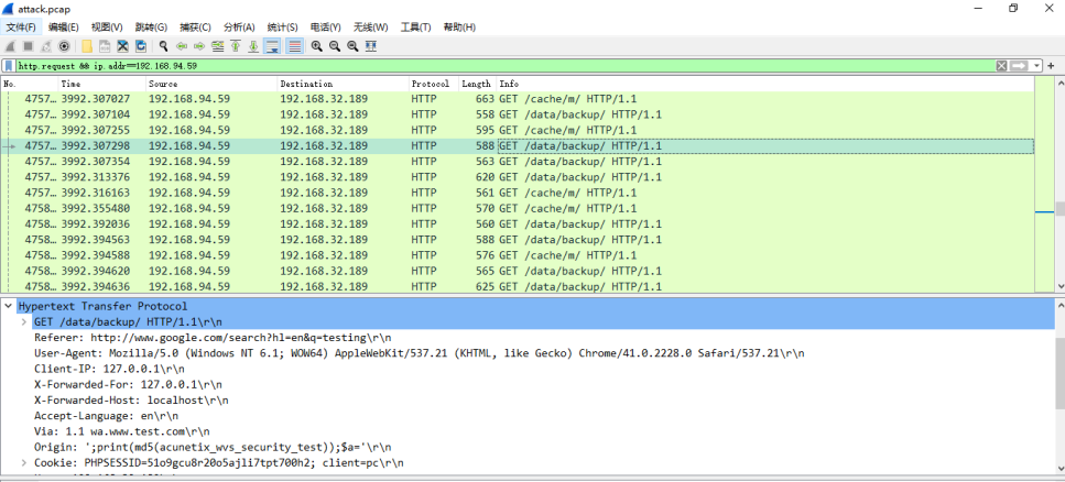过滤器里设置规则:http.request && ip.addr == 192.168.94.59 ,将来自192.168.94.59的HTTP请求包过滤出来,然后逐一排查相关数据包,发现相关HTTP协议中被注入扫描器的包头,根据特征推断是awvs。