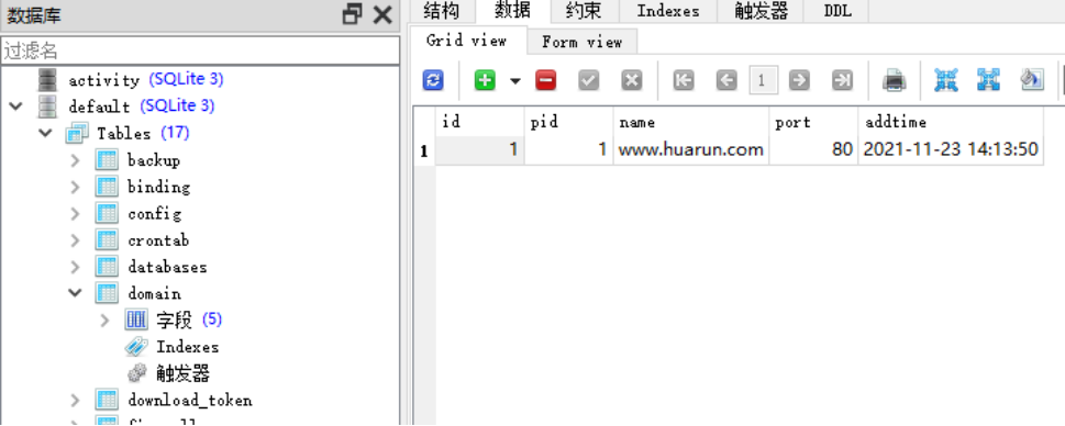 通过对该镜像的初步查看,管理系统是基于宝塔面板的,于是奔着/www/server去了。结果发现该目录下没有panel目录,想到backup目录可能会有备份,于是去/www/backup/panel/2021-11-24/data/中提取default.db,在domain字段里找到域名。
