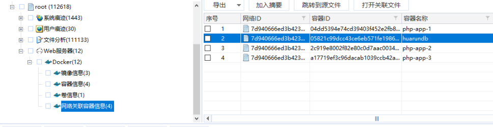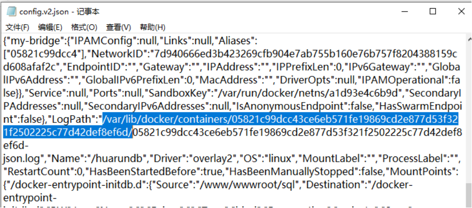 通过取证工具发现Docker下的数据库容器。双击容器名称为“huarundb”的容器,这时候会打开其配置文件,在LogPath字段中找到运行日志的目录。