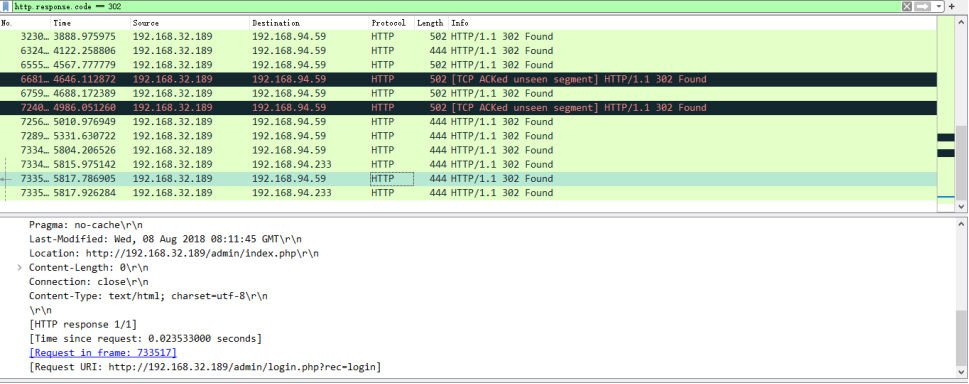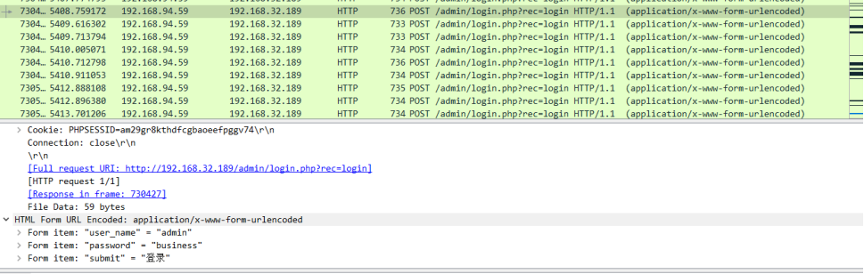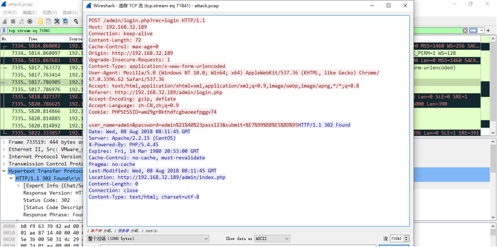 过滤器中输入规则:http.response.code == 302 ,这时候发现倒数第二个登录包重定向到了管理员首页(倒数第一个是上一题),因此我们需要追溯该回复包的请求包中的账号密码即可。