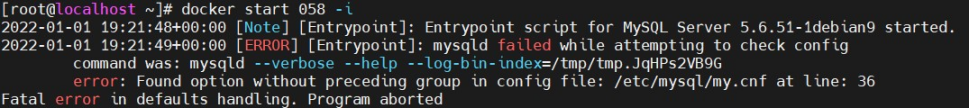 -i”启动该容器,结果失败。通过报错内容可知,MySQL容器的my.cnf文件出错。![]()