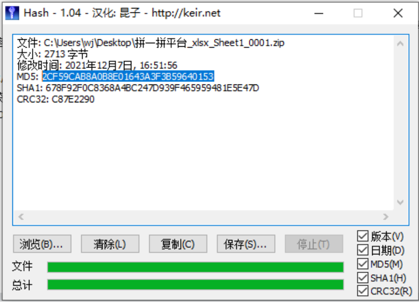 9.app中聊天记录中接收文件名为"拼一拼平台_xlsx_Sheet1_0001.zip"文件的md5(128bit)校验值。(答案格式填写小写字母与数字组合 如:abc123) (5分)