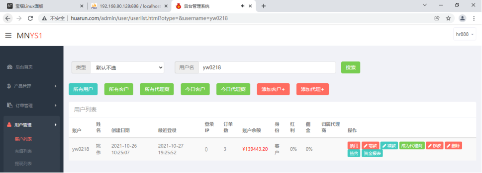 访问后台/admin,使用用户名hr888进入后台。在用户管理页面中检索用户名“yw0218”,找到该用户的余额。