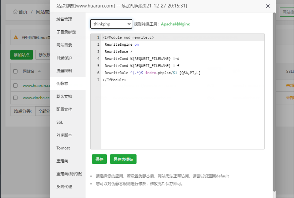 宝塔的站点里开启伪静态。修改站点的伪静态,宝塔已经提前帮我们写好了规则,选择保存即可。