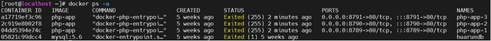 查看docker容器并尝试启动MySQL所在的容器。执行命令“docker