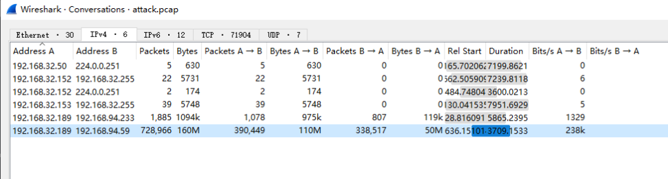 题目没有说明攻击的类型,而常见的攻击主要分为流量攻击和漏洞利用等几种类型。为了便于我们推测攻击手法,可以先查看流量较大的几个IP,wireshark里点击”统计”-“conversation”。