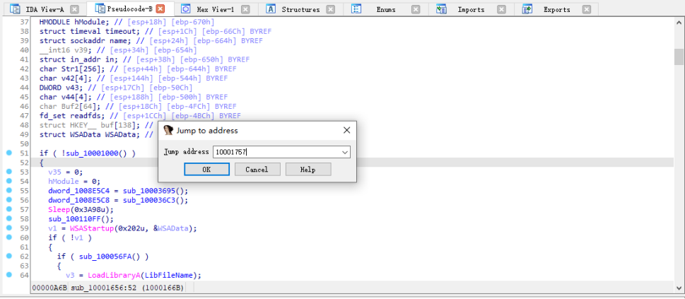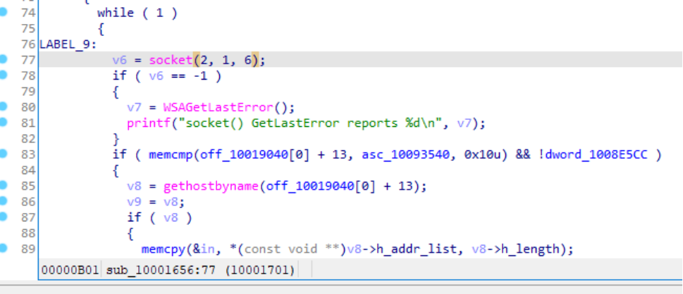 51.通过对1.dll恶意程序分析,在10001701处是一个对Socket的调用。它的第2个参数是什么?(格式:填写数字 如:1) (5分)